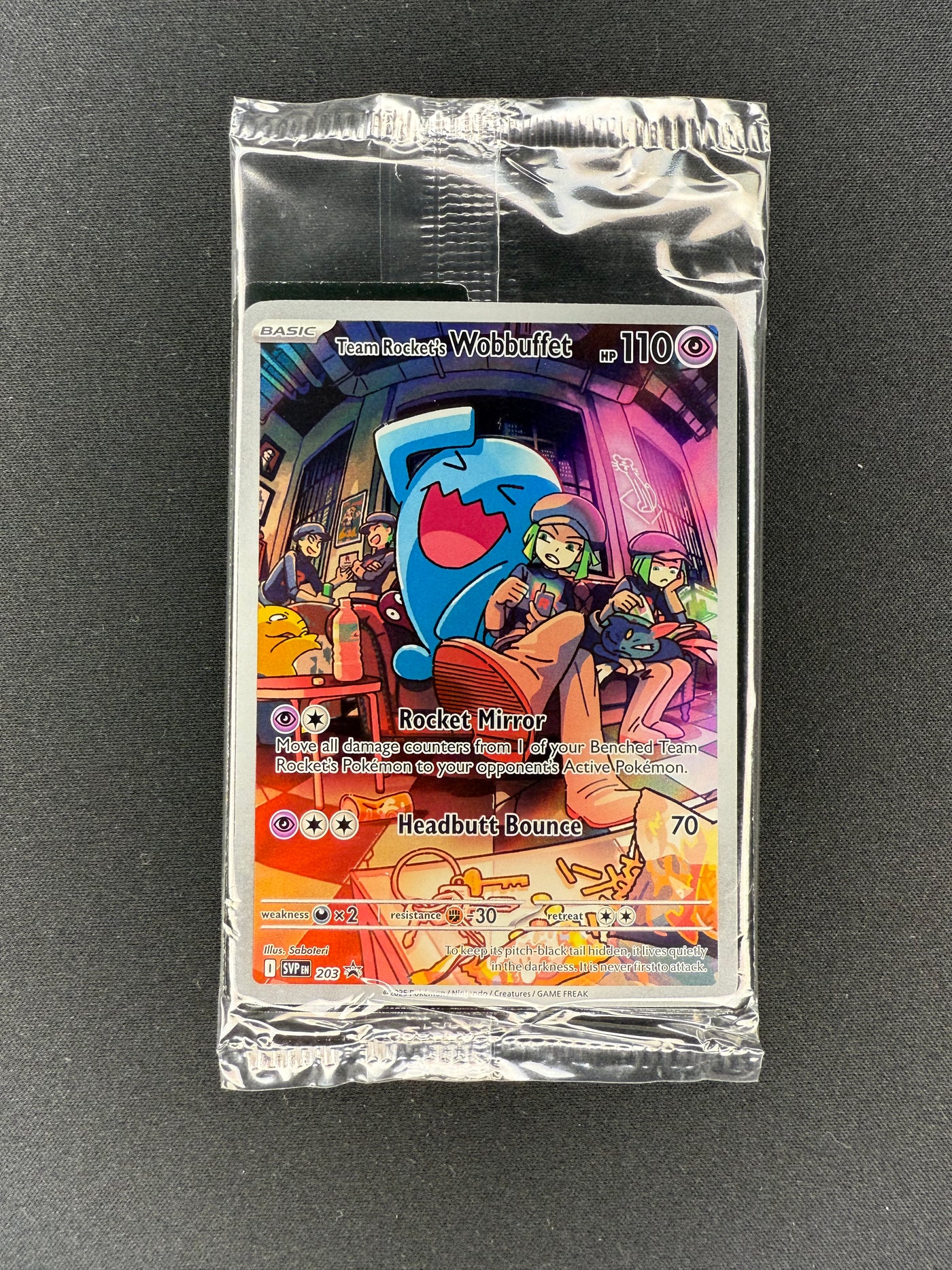 This sealed, factory-fresh promotional card features Team Rocket’s Wobbuffet (SVP 203), a beloved character from the Pokémon anime, now available as an exclusive Black Star Promo from the Sword & Shield: Destined Rivals series.